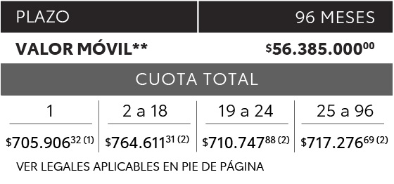 PLAN DE AHORRO PREVIO POR GRUPO CERRADO APROBADO POR RESOLUCIONES DE LA INSPECCIÓN GENERAL DE JUSTICIA N° 1490 DEL 22/08/2014 Y N° 358/2023 DEL 04/05/2023. TIPO DE PLAN 100%. ADJUDICACIÓN POR SORTEO O LICITACIÓN. PLAZO 96 CUOTAS MENSUALES. MONTO DE GASTOS DE ENTREGA SUJETO A LIBRE PACTO DENTRO DE LOS VALORES MÁXIMOS COMUNICADOS A LA INSPECCIÓN GENERAL DE JUSTICIA Y QUE LA ENTIDAD ADMINISTRADORA PONE A DISPOSICIÓN DEL SUSCRIPTOR. ADMINISTRA TOYOTA PLAN ARGENTINA S.A. DE AHORRO PARA FINES DETERMINADOS, AV. EDUARDO MADERO 1020, PISO 5°, C.A.B.A., CUIT: 30-71439695-8. VÁLIDO PARA SOLICITUDES RECIBIDAS EN LA ADMINISTRADORA DESDE EL 01 DE ENERO DE 2026 Y HASTA TANTO EXISTIERE UNA NUEVA LISTA DE PRECIOS DE TOYOTA ARGENTINA S.A. (1) CORRESPONDE AL IMPORTE DE LA CUOTA 1 DEL PLAN COROLLA CROSS XEI HEV eCVT CALCULADA SEGÚN VALOR MÓVIL VIGENTE AL 01 DE ENERO DE 2026 ($56.385.000,00). INCLUYE CARGO POR ADMINISTRACIÓN DEL 10% DE LA CUOTA PURA DE $39.093,41, PRECIO SIN IMPUESTOS NACIONALES $32.308,61. INCLUYE DERECHO DE ADHESIÓN Y PERMANENCIA (“DAP”) CORRESPONDIENTE AL 3% DEL VALOR MÓVIL + IVA, PRORRATEADO EN 24 CUOTAS ($341.129,25). EL DAP TOTAL SI SE ABONARA EN LA CUOTA 1 ES $1.691.550,00. (2) SIMULACIÓN DE IMPORTES DE LAS CUOTAS SEGÚN EL VALOR MÓVIL VIGENTE AL 01 DE ENERO DE 2026 ($ 56.385.000,00). EL IMPORTE REAL DE LAS CUOTAS 2 A 96 SE CALCULA TOMANDO COMO BASE EL VALOR MOVIL VIGENTE EN CADA EMISIÓN DIVIDIDO POR LA CANTIDAD DE CUOTAS DEL PLAN. SUJETO A VARIACIONES EN LA LISTA DE PRECIOS. ORIGEN DEL PRODUCTO: BRASIL. IMAGEN NO CONTRACTUAL. PARA MÁS INFORMACIÓN Y CONDICIONES O LIMITACIONES APLICABLES, CONSULTE EN WWW.TOYOTAPLAN.COM.AR Y EN CONCESIONARIOS OFICIALES TOYOTA.