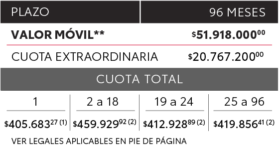 Te permite ahorrar el 60% del valor del vehículo y el 40% restante lo abonás al momento de la adjudicación. Planificá tu economía en 96 cuotas.