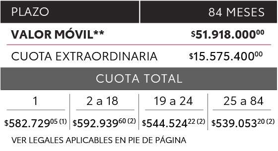 (**) VALOR MÓVIL EQUIVALENTE AL 70% DEL PRECIO DEL AUTOMOTOR SUGERIDO POR TOYOTA ARGENTINA S.A. PARA LA VENTA AL PÚBLICO. PRECIO SUGERIDO POR TOYOTA ARGENTINA S.A. PARA LA VENTA AL PÚBLICO $51.918.000,00. PRECIO SIN IMPUESTOS NACIONALES $42.907.438,02.PLAN DE AHORRO PREVIO POR GRUPO CERRADO APROBADO POR RESOLUCIONES DE LA INSPECCIÓN GENERAL DE JUSTICIA N° 1490 DEL 22/08/2014 Y N° 358/2023 DEL 04/05/2023. TIPO DE PLAN 70/30. ADJUDICACIÓN POR SORTEO O LICITACIÓN. PLAZO 84 CUOTAS MENSUALES. MONTO DE GASTOS DE ENTREGA SUJETO A LIBRE PACTO DENTRO DE LOS VALORES MÁXIMOS COMUNICADOS A LA INSPECCIÓN GENERAL DE JUSTICIA Y QUE LA ENTIDAD ADMINISTRADORA PONE A DISPOSICIÓN DEL SUSCRIPTOR. ADMINISTRA TOYOTA PLAN ARGENTINA S.A. DE AHORRO PARA FINES DETERMINADOS, AV. EDUARDO MADERO 1020, PISO 5°, C.A.B.A., CUIT: 30-71439695-8. VÁLIDO PARA SOLICITUDES RECIBIDAS EN LA ADMINISTRADORA DESDE EL 01 DE MARZO DE 2026 Y HASTA TANTO EXISTIERE UNA NUEVA LISTA DE PRECIOS DE TOYOTA ARGENTINA S.A. (1) CORRESPONDE AL IMPORTE DE LA CUOTA 1 DEL PLAN COROLLA CROSS XLI CVT CON CUOTA PURA REDUCIDA EQUIVALENTE AL 70% DEL VALOR MÓVIL VIGENTE AL 01 DE MARZO DE 2026 ($ 51.918.000,00). INCLUYE CARGO POR ADMINISTRACIÓN DEL 10% DE LA CUOTA PURA DE $28.771,92, PRECIO SIN IMPUESTOS NACIONALES $23.778,44. INCLUYE DERECHO DE ADHESIÓN Y PERMANENCIA (“DAP”) CORRESPONDIENTE AL 3% DEL VALOR MÓVIL + IVA, PRORRATEADO EN 24 CUOTAS ($314.103,90). EL DAP TOTAL SI SE ABONARA EN LA CUOTA 1 ES $1.557.540,00. (2) SIMULACIÓN DE IMPORTES DE LAS CUOTAS SEGÚN EL VALOR MÓVIL VIGENTE AL 01 DE MARZO DE 2026 ($ 51.918.000,00). EL IMPORTE REAL DE LAS CUOTAS 2 A 84 SE CALCULA TOMANDO COMO BASE EL 70% DEL VALOR MOVIL VIGENTE EN CADA EMISIÓN DIVIDIDO POR LA CANTIDAD DE CUOTAS DEL PLAN. EL 30% RESTANTE (CUOTA COMPLEMENTARIA) SE INTEGRA JUNTO CON LA ACEPTACIÓN DE LA ADJUDICACIÓN. SUJETO A VARIACIONES EN LA LISTA DE PRECIOS. ORIGEN DEL PRODUCTO: BRASIL. IMAGEN NO CONTRACTUAL. PARA MÁS INFORMACIÓN Y CONDICIONES O LIMITACIONES APLICABLES, CONSULTE EN WWW.TOYOTAPLAN.COM.AR Y EN CONCESIONARIOS OFICIALES TOYOTA.