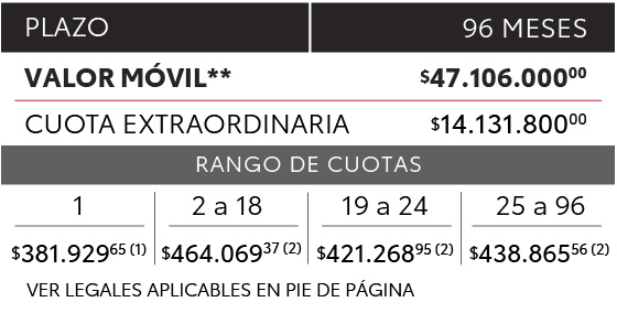 (**) VALOR MÓVIL EQUIVALENTE AL 70% DEL PRECIO DEL AUTOMOTOR SUGERIDO POR TOYOTA ARGENTINA S.A. PARA LA VENTA AL PÚBLICO. PRECIO SUGERIDO POR TOYOTA ARGENTINA S.A. PARA LA VENTA AL PÚBLICO $47.106.000,00. PRECIO SIN IMPUESTOS NACIONALES $42.629.864,25. PLAN DE AHORRO PREVIO POR GRUPO CERRADO APROBADO POR RESOLUCIONES DE LA INSPECCIÓN GENERAL DE JUSTICIA N° 1490 DEL 22/08/2014 Y N° 358/2023 DEL 04/05/2023. TIPO DE PLAN 70/30. ADJUDICACIÓN POR SORTEO O LICITACIÓN. PLAZO 96 CUOTAS MENSUALES. MONTO DE GASTOS DE ENTREGA SUJETO A LIBRE PACTO DENTRO DE LOS VALORES MÁXIMOS COMUNICADOS A LA INSPECCIÓN GENERAL DE JUSTICIA Y QUE LA ENTIDAD ADMINISTRADORA PONE A DISPOSICIÓN DEL SUSCRIPTOR. ADMINISTRA TOYOTA PLAN ARGENTINA S.A. DE AHORRO PARA FINES DETERMINADOS, AV. EDUARDO MADERO 1020, PISO 5°, C.A.B.A., CUIT: 30-71439695-8. VÁLIDO PARA SOLICITUDES RECIBIDAS EN LA ADMINISTRADORA DESDE EL 01 DE OCTUBRE DE 2025 Y HASTA TANTO EXISTIERE UNA NUEVA LISTA DE PRECIOS DE TOYOTA ARGENTINA S.A. (1) CORRESPONDE AL IMPORTE DE LA CUOTA 1 DEL PLAN HILUX 4X2 D/C DX CON CUOTA PURA REDUCIDA EQUIVALENTE AL 70% DEL VALOR MÓVIL VIGENTE AL 01 DE OCTUBRE DE 2025 ($ 47.106.000,00). INCLUYE CARGO POR ADMINISTRACIÓN DEL 10% DE LA CUOTA PURA DE $10.373,68, PRECIO SIN IMPUESTOS NACIONALES $8.573,29. INCLUYE DERECHO DE ADHESIÓN Y PERMANENCIA (“DAP”) CORRESPONDIENTE AL 3% DEL VALOR MÓVIL + IVA, PRORRATEADO EN 24 CUOTAS ($284.991,30). EL DAP TOTAL SI SE ABONARA EN LA CUOTA 1 ES $1.413.180,00. (2) SIMULACIÓN DE IMPORTES DE LAS CUOTAS SEGÚN EL VALOR MÓVIL VIGENTE AL 01 DE OCTUBRE DE 2025 ($ 47.106.000,00). EL IMPORTE REAL DE LAS CUOTAS 2 A 96 SE CALCULA TOMANDO COMO BASE EL 70% DEL VALOR MOVIL VIGENTE EN CADA EMISIÓN DIVIDIDO POR LA CANTIDAD DE CUOTAS DEL PLAN. EL 30% RESTANTE (CUOTA COMPLEMENTARIA) SE INTEGRA JUNTO CON LA ACEPTACIÓN DE LA ADJUDICACIÓN. SUJETO A VARIACIONES EN LA LISTA DE PRECIOS. ORIGEN DEL PRODUCTO: ARGENTINA. IMAGEN NO CONTRACTUAL. PARA MÁS INFORMACIÓN Y CONDICIONES O LIMITACIONES APLICABLES, CONSULTE EN WWW.TOYOTAPLAN.COM.AR Y EN CONCESIONARIOS OFICIALES TOYOTA.