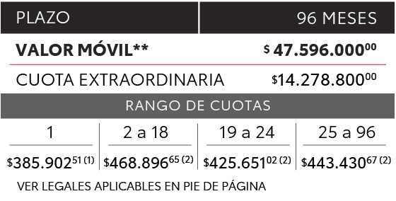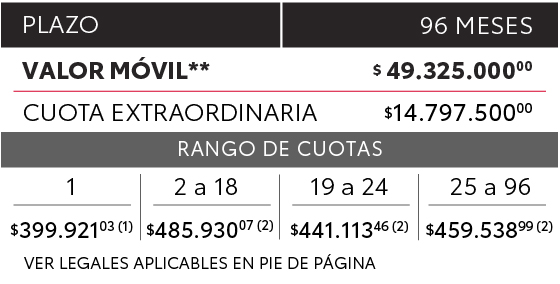 Te permite ahorrar el 70% del valor del vehículo y el 30% restante lo abonás al momento de la adjudicación. Planificá tu economía en 96 cuotas.