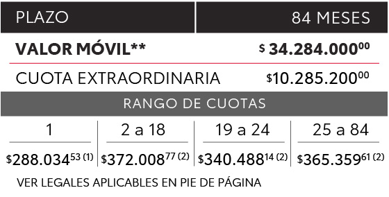 (**) VALOR MÓVIL EQUIVALENTE AL 70% DEL PRECIO DEL AUTOMOTOR SUGERIDO POR TOYOTA ARGENTINA S.A. PARA LA VENTA AL PÚBLICO. PRECIO SUGERIDO POR TOYOTA ARGENTINA S.A. PARA LA VENTA AL PÚBLICO $34.284.000,00. PRECIO SIN IMPUESTOS NACIONALES $28.333.884,30.